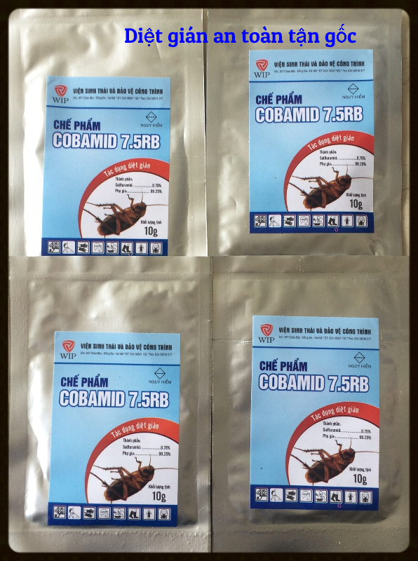 Bả diệt gián COBAMID 7.5RB là bả dạng bột có màu vàng sậm, được đóng gói trong túi thiếc với khối lượng tịnh 10g/gói