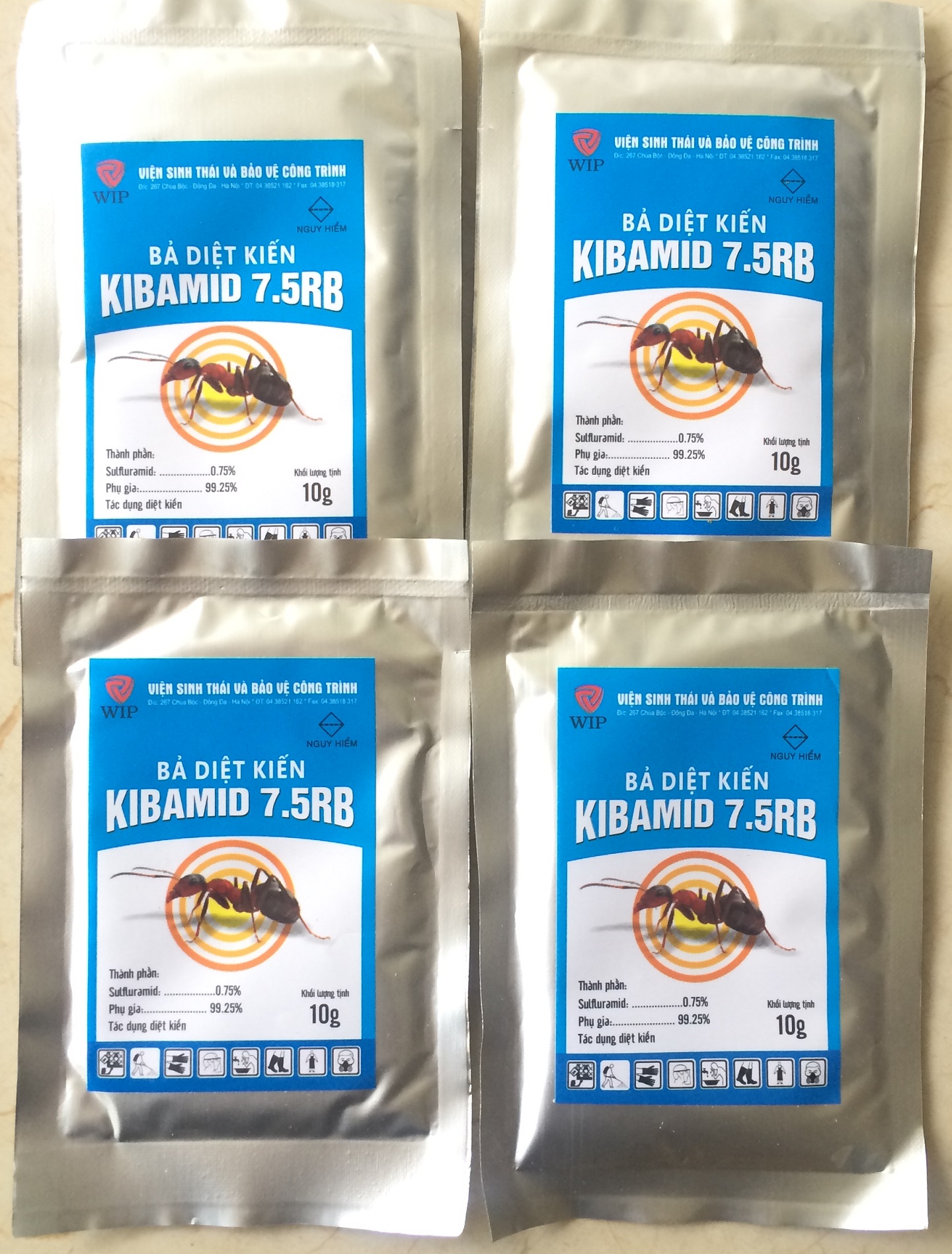 Bả diệt kiến KIBAMID 7.5RB là bả dạng bột có màu vàng sậm, được đóng gói trong túi thiếc với khối lượng tịnh 10g/gói